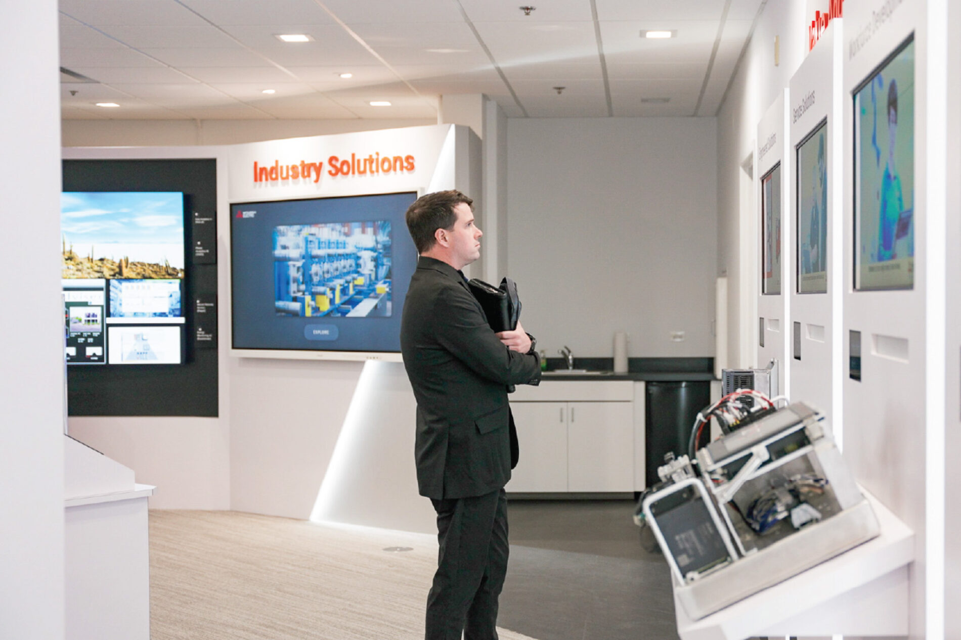 Jack Morton led a comprehensive overhaul, from structural renovation and spatial reconfiguration to immersive content development. Working closely with internal stakeholders, architects, engineers, and contractors, we delivered a turnkey experiential environment anchored by live, interactive technology. A real-time Smart Manufacturing Demo—integrated with an eight-monitor Command Center—brings dynamic data to life, while a tactile Collaboration Table uses object recognition to trigger video content and product stories. Every digital interface and touchpoint was thoughtfully designed to integrate seamlessly with physical product displays, resulting in a forward-looking showroom that balances innovation with real-world application.