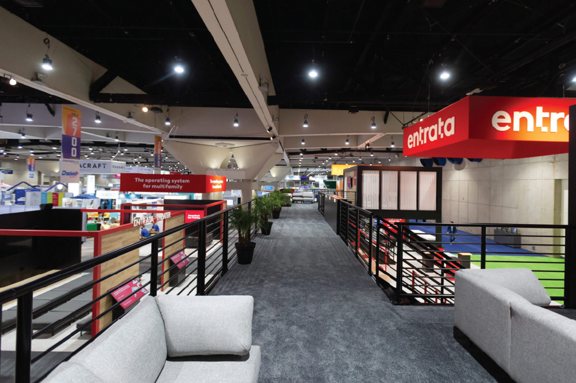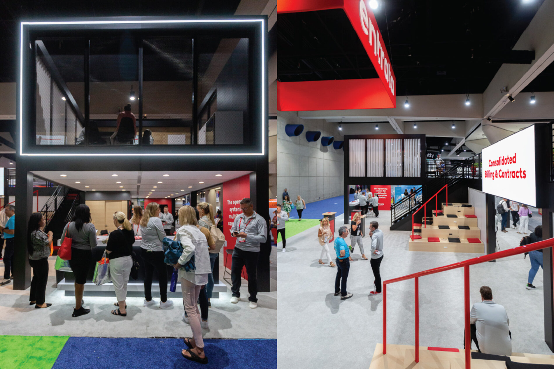 Matte-black towers featuring dimensional ENTRATA logos framed the exhibit and established the space’s bold design language, while a wraparound deck at the front created a welcoming funnel for traffic from the main hall entrance. Inside, industrial textures, dynamic LED graphics, layered lighting, and varied seating options formed an energetic central hub. Across two levels, the environment supported everything from casual conversations to private group meetings, creating a versatile setting that combined brand presence, engagement, and business utility in one cohesive experience.