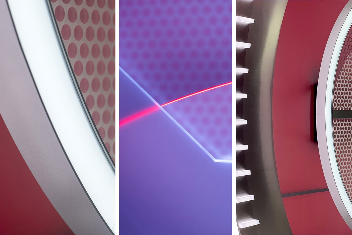 We then explored a whole new look for the East wall, reimagining the catwalk and framing the main stone wall with a wood portal to add an essence of warmth to the set. Lastly, we tackled the west wall and introduced the largest touch screen in the entire world of sports. Spanning 110” diagonally, it cantilevers out in front of the dimensional acrylic wall with color pixel tape so the entire wall can change color and create patterns to line up with the unique graphic design. Above this is a large LED banner that flanks down to create two LED towers to create interesting moments of content from above, left and right. We also reimagined the sportscaster desk, creating something new that is clean yet future forward as well as a new conversational desk that harkens to future proof design aesthetic.